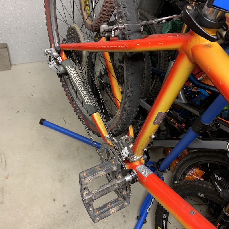Also habe ich das Baby mitgenommen und erstmal nackig gemacht. Alle Teile, die ich weiter verwenden wollte, wurden tiefengereinigt, die Lager neu gefettet und der Rahmen aufpoliert. Dann begann die Suche nach Teilen für den Wiederaufbau. Der tolle gelb-rote Sunburst Paintjob sollte durch weitere rote Teile noch mehr zum Leuchten gebracht werden. Also bestellte ich rote Griffe, rote Außenhüllen, frische Bremsbeläge mit rotem Belag, rote Zugendnippel, einen roten Flaschenhalter und ein rotes narrow-wide Kettenblatt. Vorne sollten sich statt drei nämlich nur noch ein Kettenblatt drehen. Die „narrow-wide“ Kettenblätter verhindern durch ihr Profil, dass die Kette vom Kettenblatt fällt. Ein neuer Sattel und eine frische Kette mussten her und natürlich ein Daumenschalter mit passendem Schaltwerk. Außerdem mussten passend zu den dicken Alurohren auch ein paar dicke Reifen her. Die Maxxis Holy Roller in 26×2,40 sind da genau richtig.