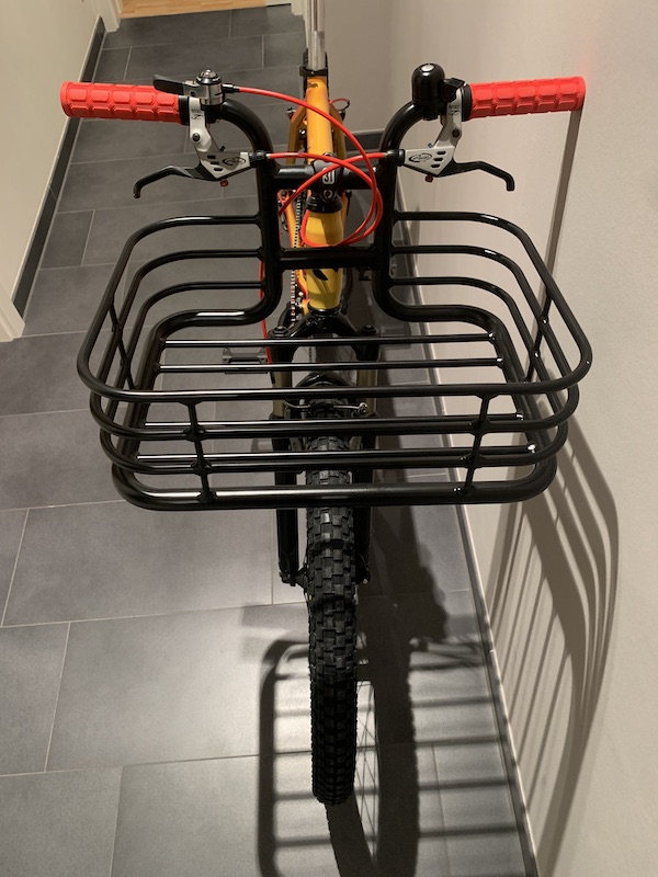 Eigentlich dachte ich an einen Flat Rack – einen flachen Vorderradgepäckträger. Das war aber nicht so einfach wegen der Federgabel, denn da läßt sich sowas nicht montieren. Und im Gespräch kam dann der Wunsch nach einem Korb statt einer flachen Auflage. Gut!! In Italien habe ich in einem Radladen mal eine Lenker-Gepäckträger-Kombi gesehen. Und die habe ich auch bei einem Radladen bei Hamburg wieder gefunden.